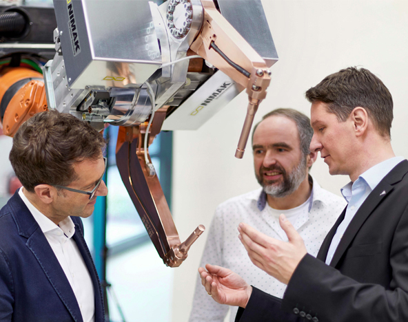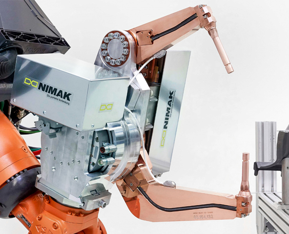 El diseño compacto de nuestra innovadora unidad de motor reductor, junto con su alta densidad de par, rigidez y dinámica, permitió a NIMAK concebir un sistema de construcción de pinzas de soldadura totalmente nuevo. El galaxy®GUN aumenta enormemente la productividad de los procesos de soldadura. Y eso no es todo. Gracias a una generación de fuerza dinámica más rápida, se pueden soldar nuevos y diversos materiales.